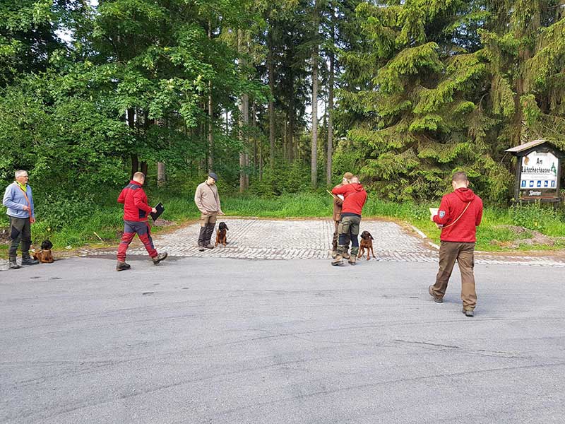 Dann geht es direkt los. Als erstes tritt Hubert mit seiner Hündin Emma an. Sie beginnen die Suche unter Aufsicht der Richter Ulli Tischer und Tino Fiedler sowie den Richteranwärtern Dr. Gerhard Struck und Marcel Handrich. Nachdem die Suche vorangeschritten ist, verlassen die Losnummer 3 bis 5 den Morgensammelplatz und begeben sich unter ortskundiger Führung durch Züchter Peter an die Waldhütte im Revierzentrum, um dort auf ihren Einsatz zu warten. Nur Losnummer 2, Franz mit Vitus, bleiben alleine zurück, um sich auf die Suche vorzubereiten und nervlich zu sammeln. Nach fleißiger Suche kommt schließlich Emma mit Führer Hubert gekonnt bis zum Stück. Die erste Hürde ist also geschafft, erstmal durchatmen.